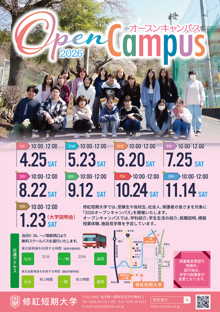 お知らせ オープンキャンパス2026の開催について 2026.04.16 修紅短期大学では、受験生、高校生、社会人及び保護者の皆さまを対象に「オープンキャンパス2026」を開催いたします。 オープンキャンパスでは、学科紹介、学生生活の紹介、就職説明、模擬授業体験、施設見学等を予定しています。 公開講座2026のお知らせ 前の記事