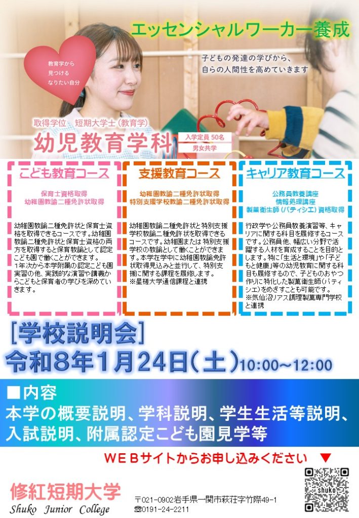 修紅短期大学では、1月24日に受験生や高校生、保護者の皆さまを対象に「学校説明会」を開催いたします。